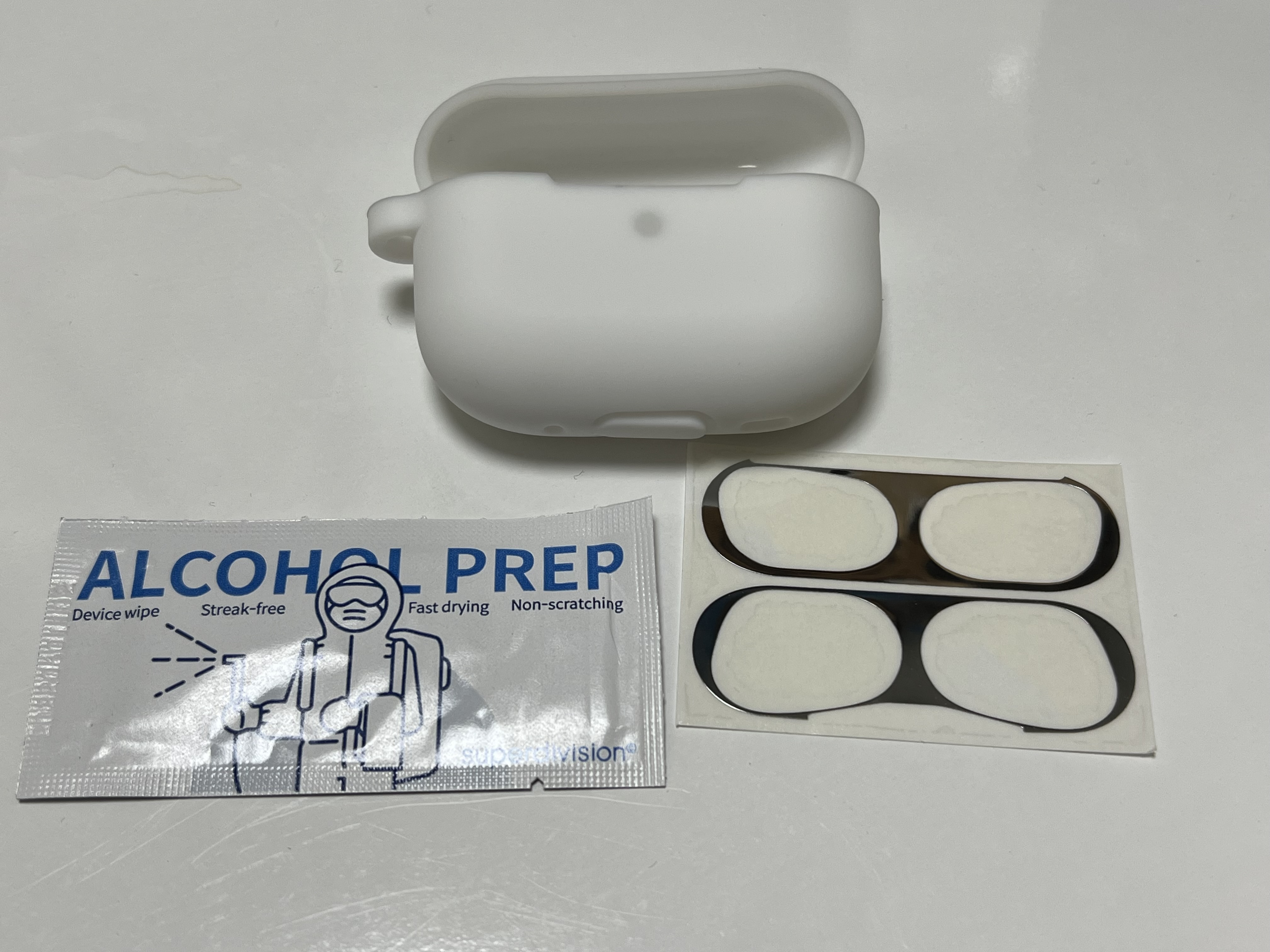 슈퍼디비전 밸런스 에어팟 프로2용 케이스에는 본체에 씌울 수 있는 실리콘 재질의 케이스와 에어팟 프로2 본체를 닦아낼 수 있는 알콜 수건, 철가루 방지용 스티커가 들어 있습니다.