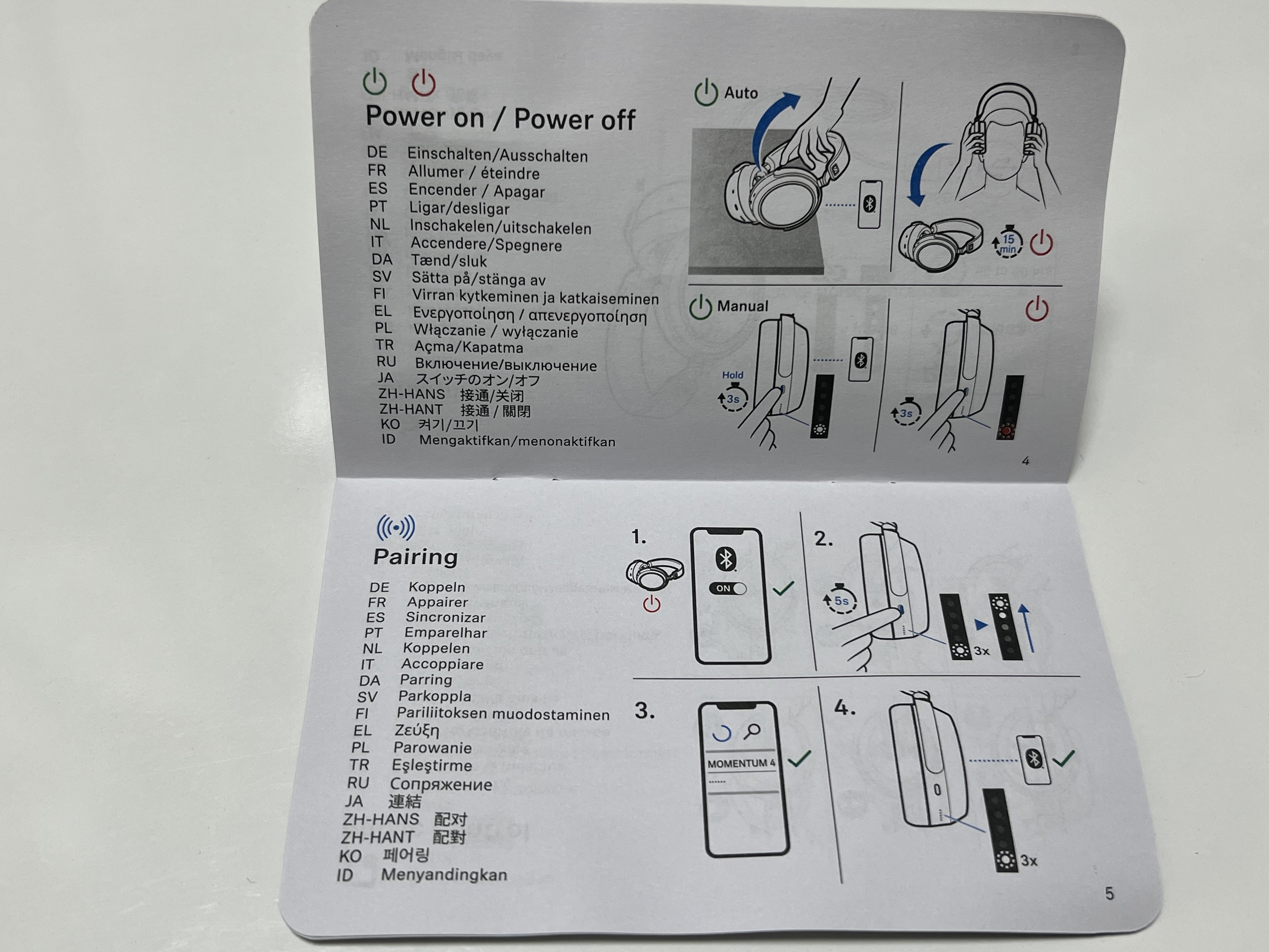 젠하이저 모멘텀4의 퀵가이드는 정말 많은 언어를 지원하지만 저게 지원하는 거라고 할 수 있을지는 모르겠습니다. 켜기/끄기, 페어링 이렇게만 되어 있어요. 조금 더 성의 있는 가이드 제공이 필요해 보입니다.