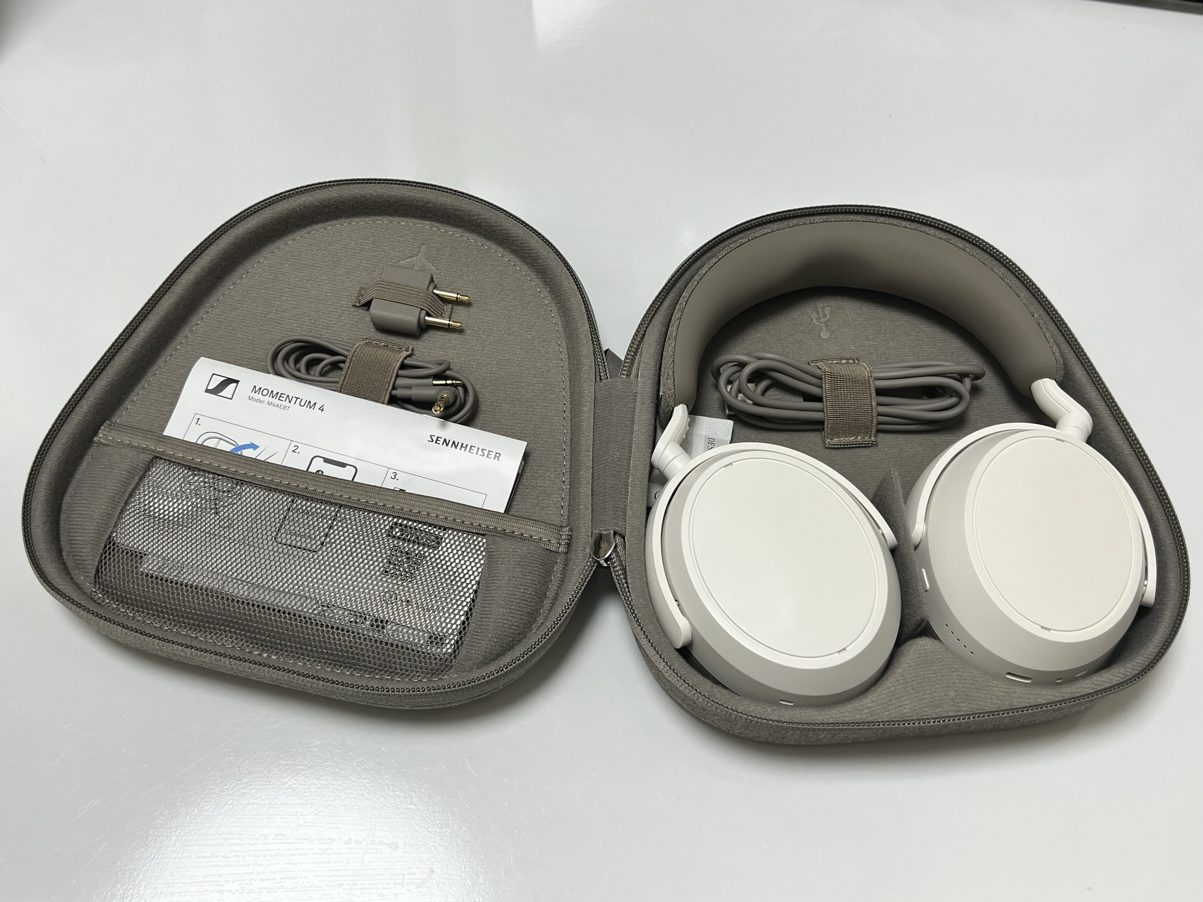 젠하이저 모멘텀4의 캐링 케이스는 다소 큰 편입니다. 그건 헤드폰의 접는 기능이 제한적이기 때문일 겁니다. 소니의 WH-1000XM5와 거의 비슷한 크기와 모양입니다. 그 말은 그 제품과 비슷한 모양으로 수납되어 있다는 뜻이겠죠. 하지만 재질은 지금까지 제가 사용한 5개의 헤드폰 중 가장 고급스럽습니다. 꺼슬꺼슬한 게 꼭 데님 재질 같습니다.