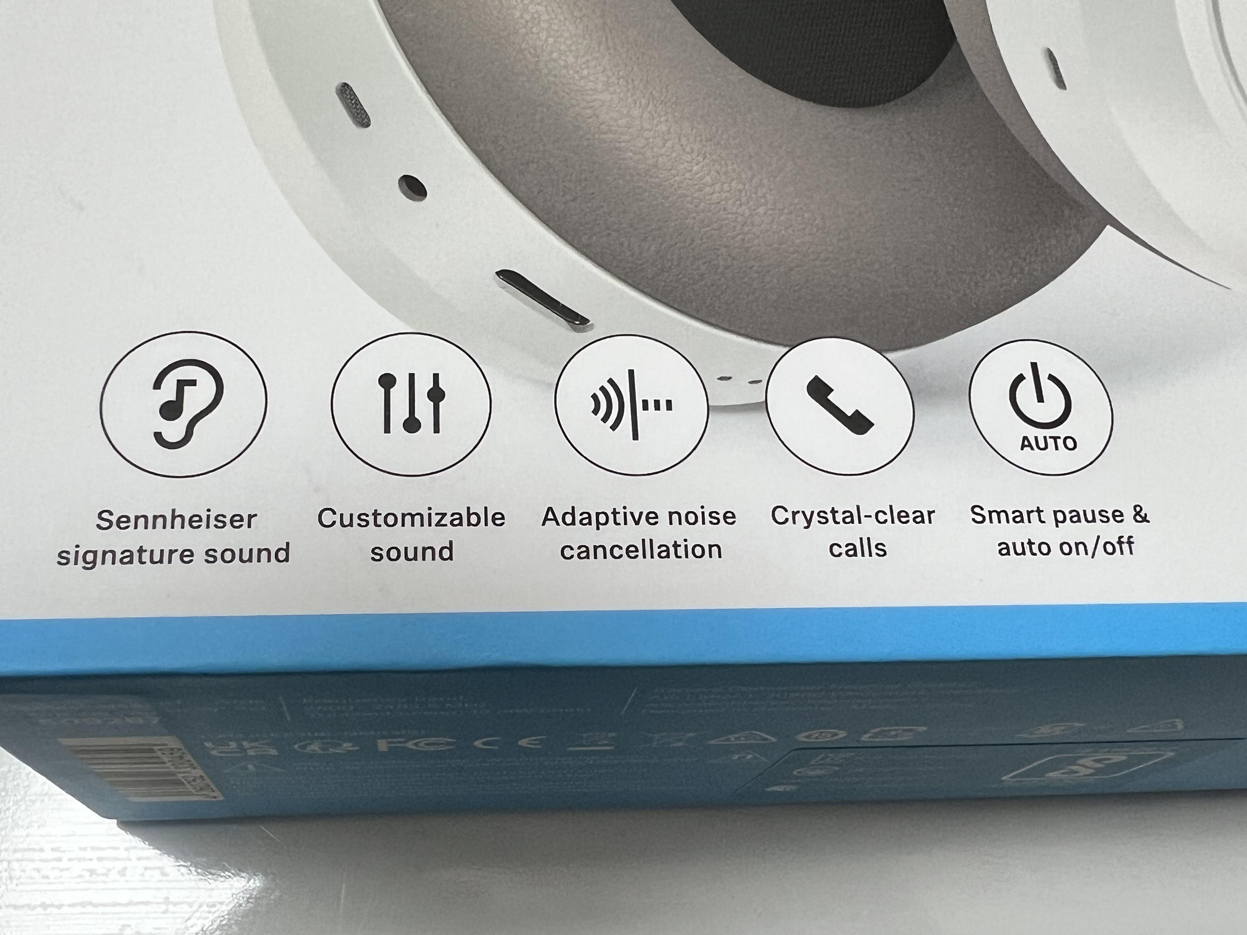 젠하이저 모멘텀4 박스 아래쪽에는 여러 아이콘과 함께 기능을 설명하고 있습니다. 젠하이저 시그니처 사운드, 커스텀이 가능한 사운드를 시작으로 능동형 소음 감소 기능, 수정 같이 깨끗한 통화음, 자동 온 오프와 스마트 멈춤 기능이 있다고 안내하고 있습니다. 근데 가장 중요할 수도 있을 AptX Adaptive 코덱 지원에 관한 내용은 없는 것도 신기합니다. LDAC 코덱을 채용한 제품들은 하나같이 LDAC 로고를 붙여 놓는데 말입니다. Hi-Res 인증이 없는 것도 의외고요. 하지만 Hi-Res 인증이 곧 음질의 뛰어남을 의미하는 것은 아니기 때문에 별로 문제될 건 아닙니다.