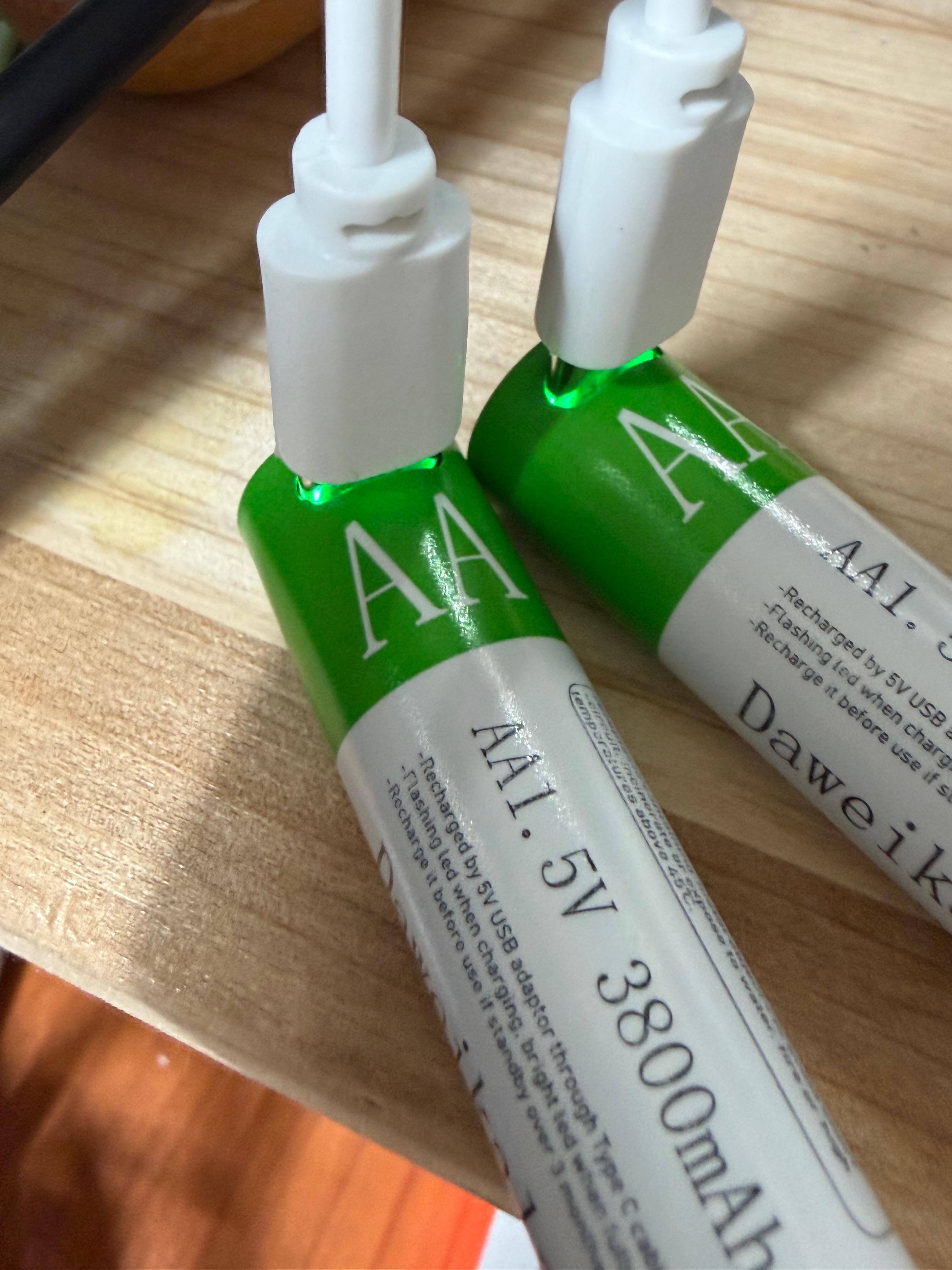 LIKEKALA USB C 충전지 AA 사이즈 배터리는 USB C 단자가 원통형의 직각 방향에 있어서 꽂는 것도 수월합니다. 충전중에는 녹색 LED가 반짝반짝거립니다. 충전이 끝나면 녹색 LED가 계속 켜져 있습니다.