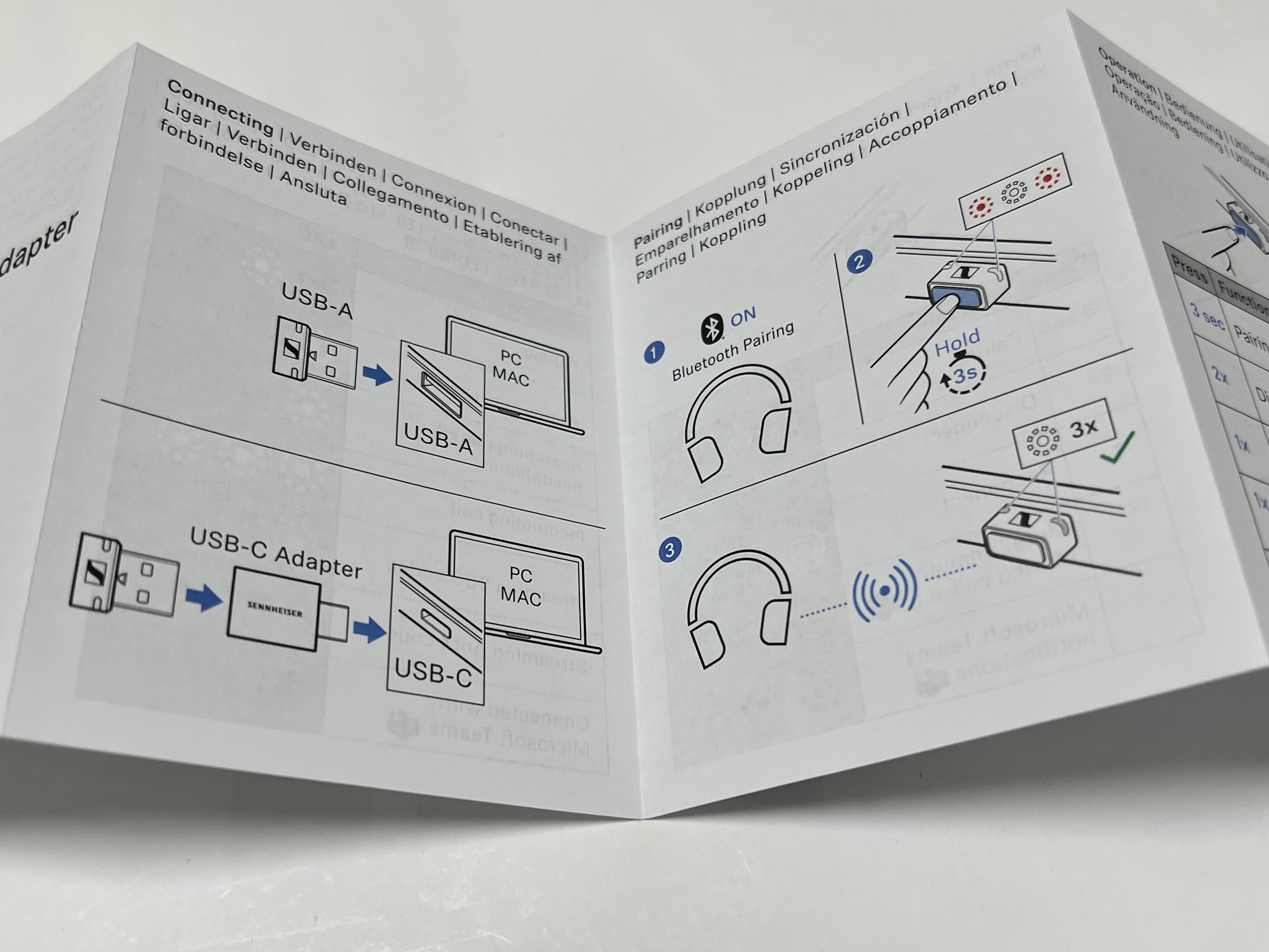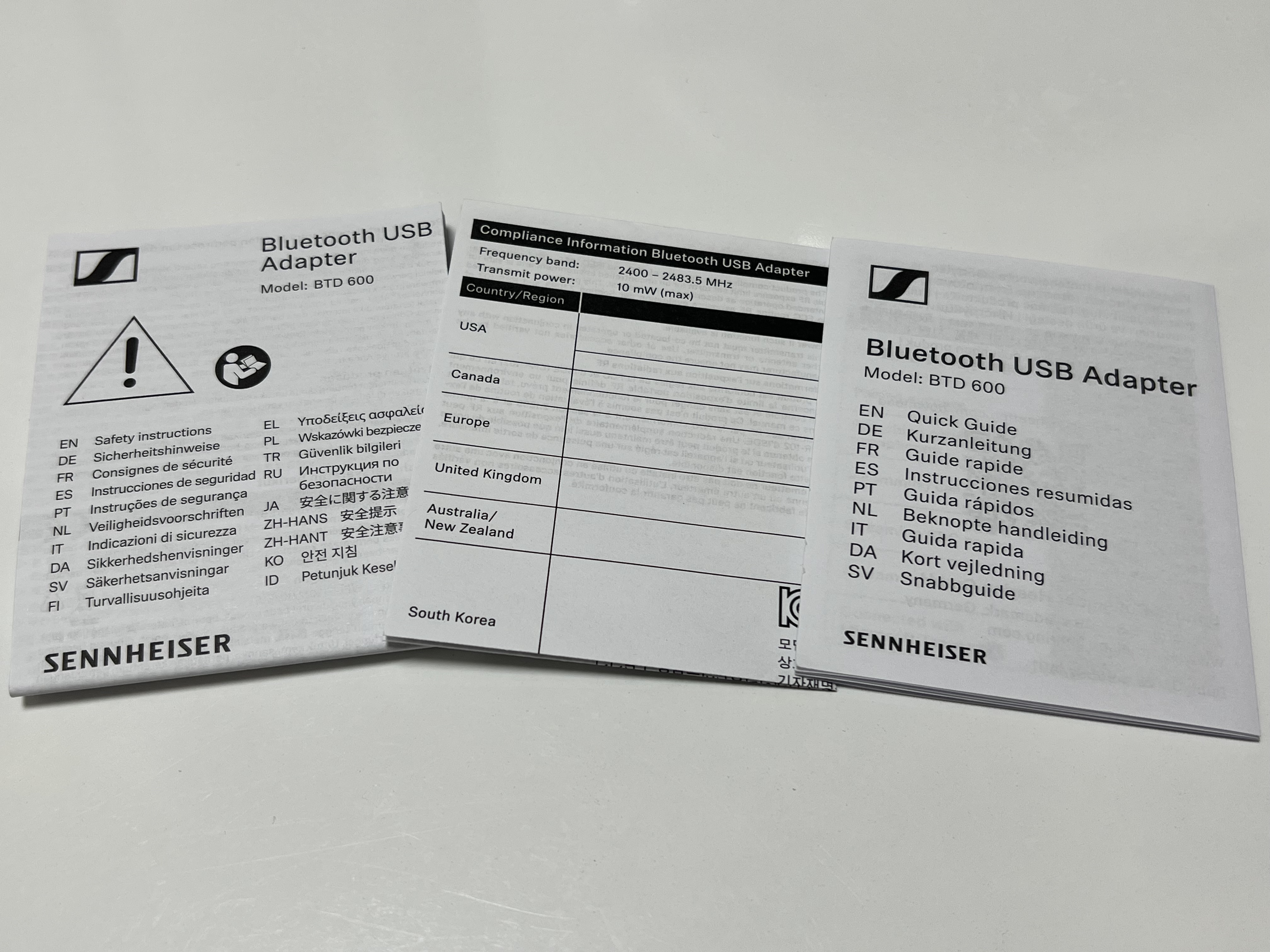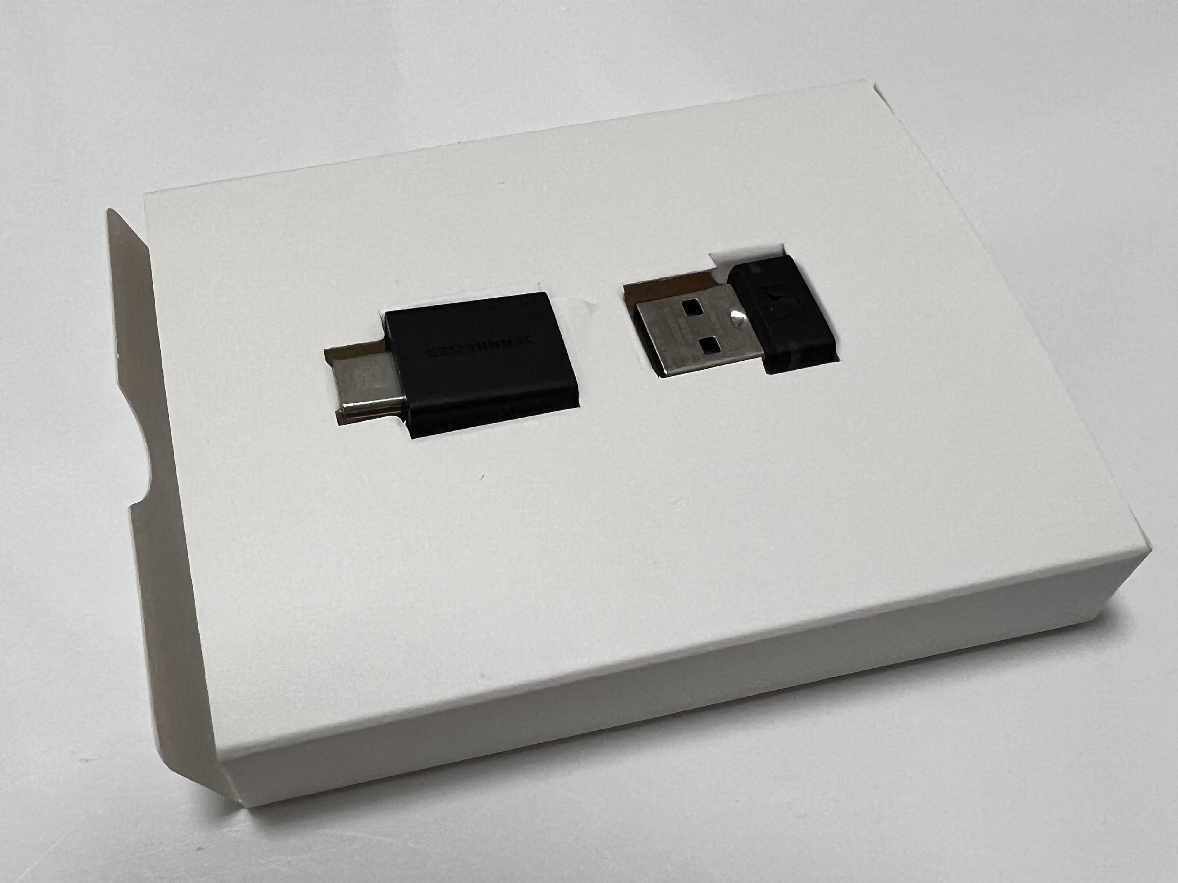 젠하이저 BTD600의 박스를 열면 이렇게 USB C, USB A 단자를 가진 것들이 들어 있습니다. 사이즈를 보면 USB C 단자를 가진 쪽이 메인이고 USB A 단자를 가진 게 변환젠더 같지만 아닙니다. USB A 단자를 가진 쪽이 메인 제품입니다. USB C 는 반대쪽이 뚫려있는 변환젠더입니다.