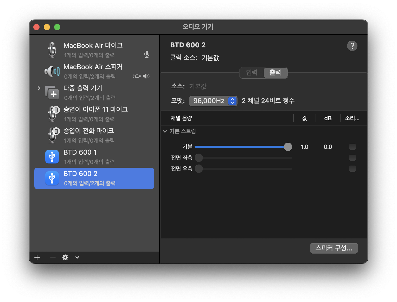 맥북의 '오디오 MIDI 설정'에 들어가서 확인해 보면 96,000Hz, 24비트 정수의 포맷으로 출력이 가능함을 확인할 수 있습니다. 이렇게 설정을 해 주고 헤드폰/이어폰 앱에 들어가서 Adaptive 고음질 모드를 켜면 제대로 된 고음질 소리를 들을 수 있습니다.