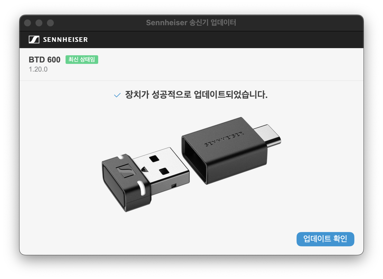 펌웨어 업데이트 과정은 다른 제품들과 크게 다르지 않습니다. 기본적으로 어플리케이션을 컴퓨터에 다운로드 받고 설치한 후 실행을 시킵니다. 그리고 USB 단자에 BTD600을 꽂으면 장치가 자동으로 인식해서 제품 내의 펌웨어 버전과 비교를 한 후 업데이트가 필요하면 업데이트 진행을 합니다. 업데이트가 끝나면 제품을 한 번 재부팅해서 USB에서 다시 인식을 시켜 주게 되는데 장치가 성공적으로 업데이트 된 것을 확인할 수 있습니다. 제품명 옆에 녹색 테두리로 '최신 상태임'으로 되어 있습니다.