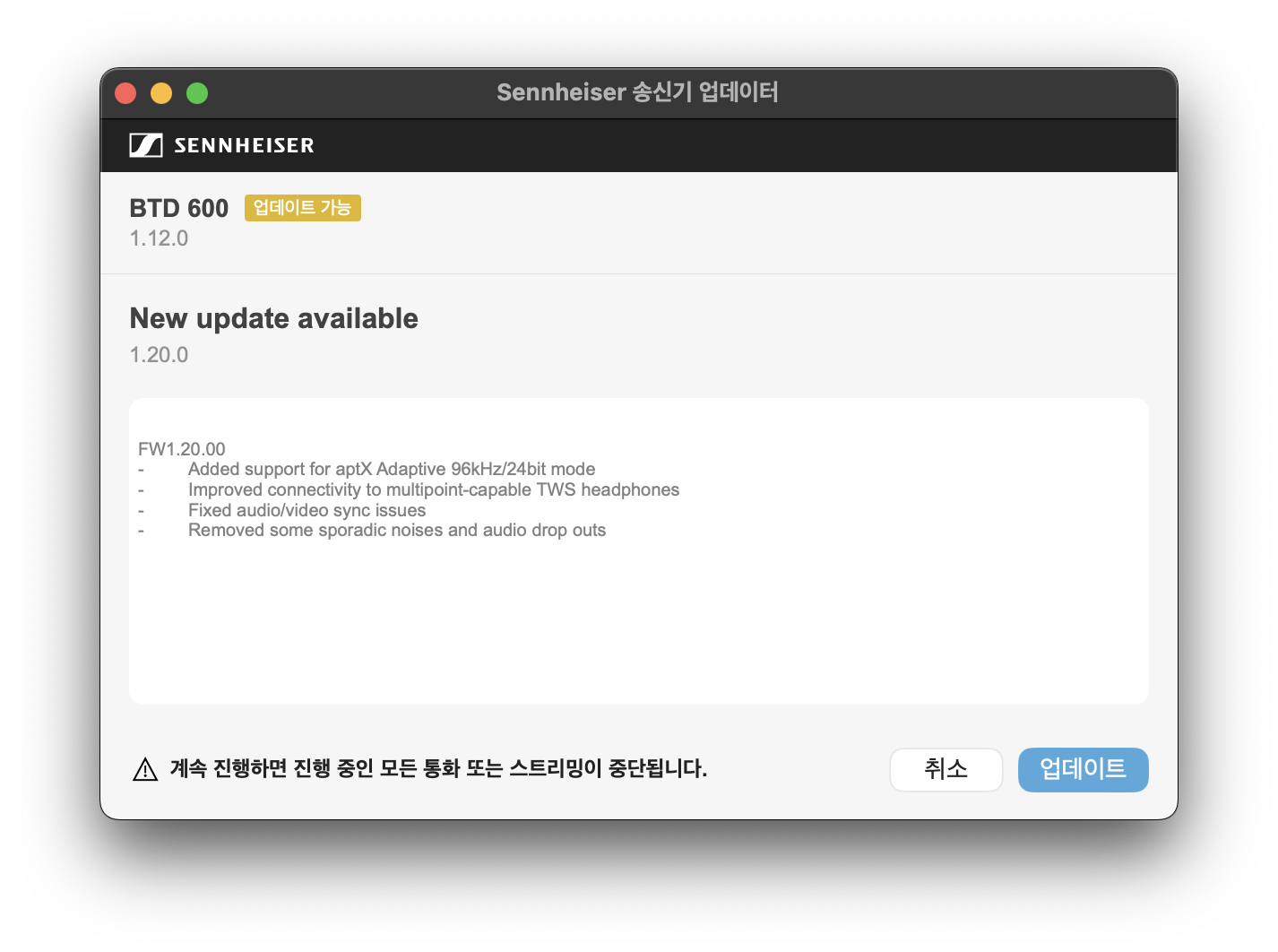 젠하이저 BTD600은 블루투스 5.2를 지원합니다. AptX Adaptive 코덱을 비롯하여 AptX, SBC 코덱을 지원합니다. 하지만 우리가 굳이 동글까지 써가면서 SBC, AptX를 사용할 일은 없을 거고, 24비트/96KHz로 샘플링된 음원을 전송할 수 있는 AptX Adaptive 코덱을 주로 사용하게 될 겁니다. 제품이 처음 나왔을 때만 하더라도 96KHz가 지원되지 않았습니다. 펌웨어 업데이트를 통해 이제는 24비트/96KHz를 사용할 수 있게 됐습니다.