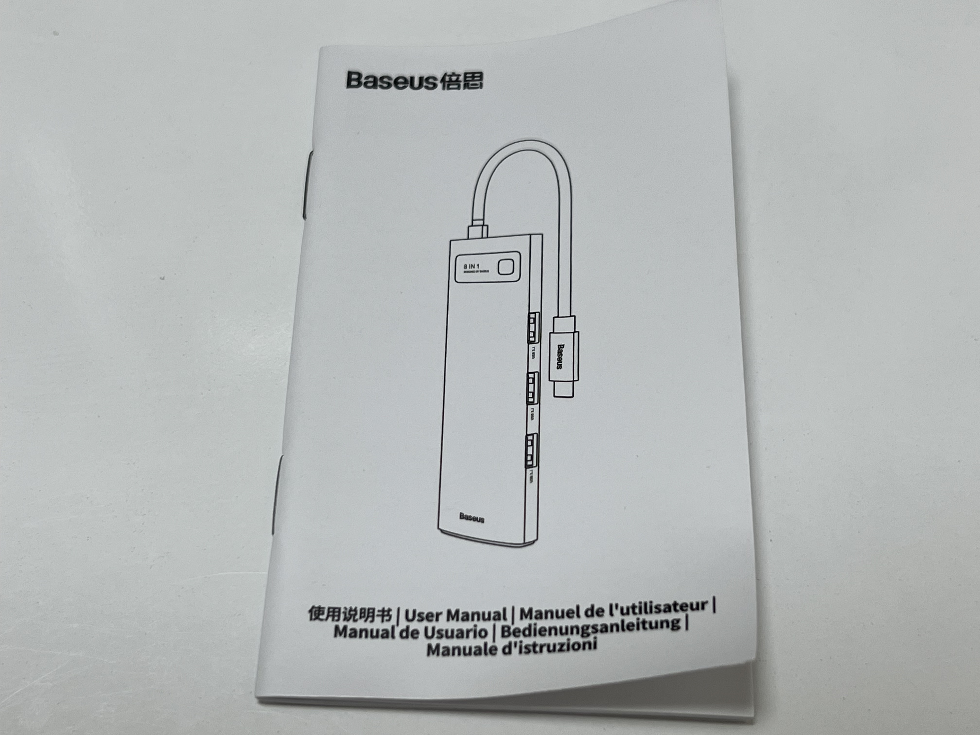 Baseus 8in1 USB 3.1 허브의 구성물은 제품과 다국어 설명서입니다. 별로 특별할 게 없는 구성이지만 포장은 굉장히 깔끔하게 되어 있습니다.